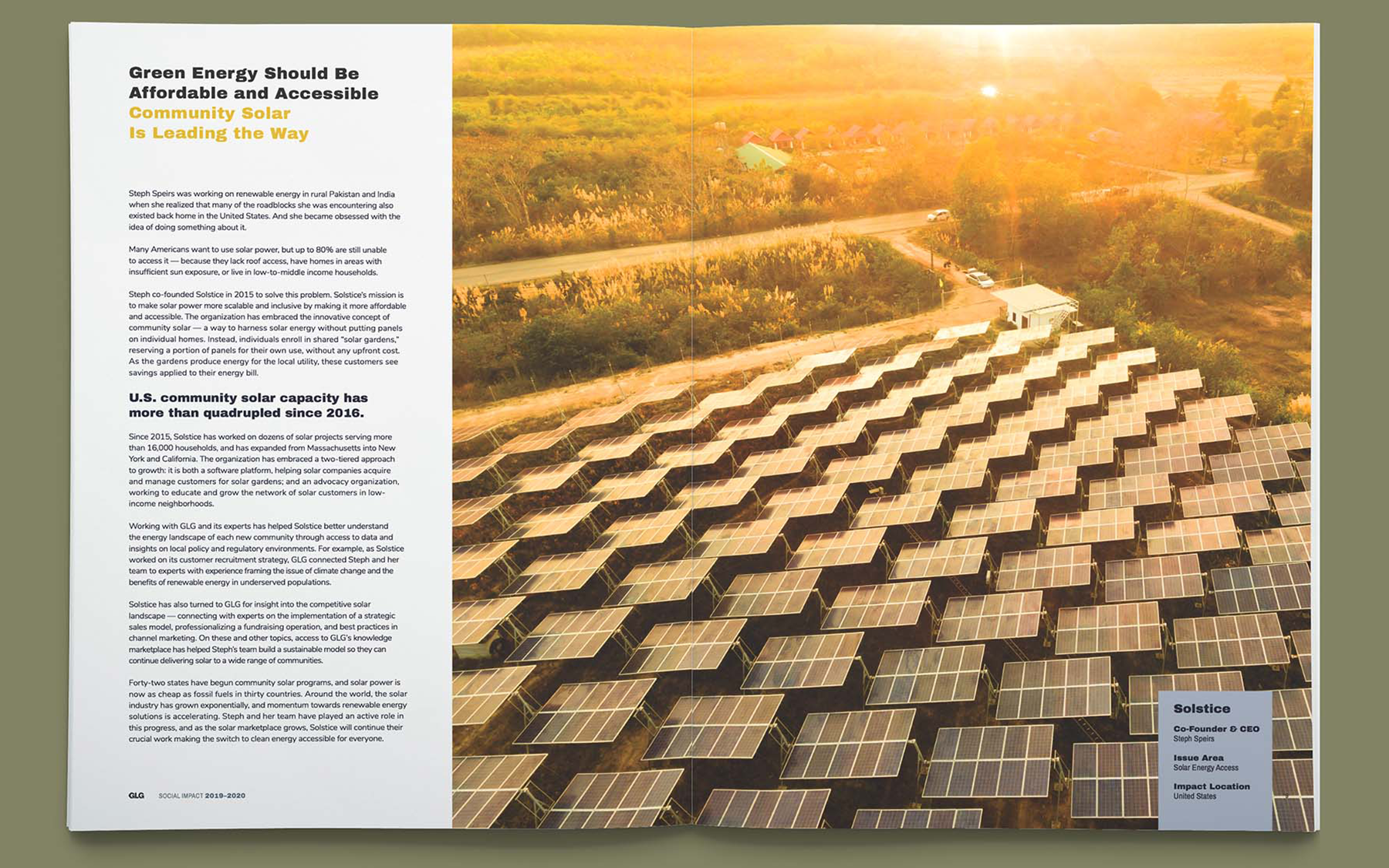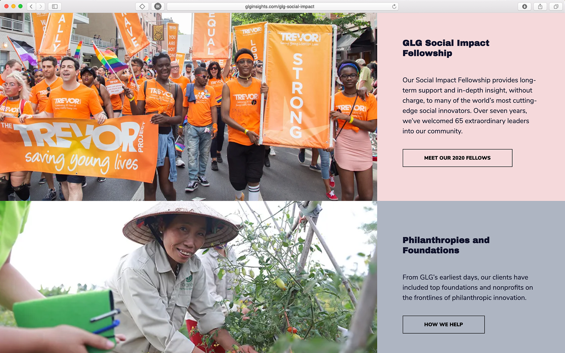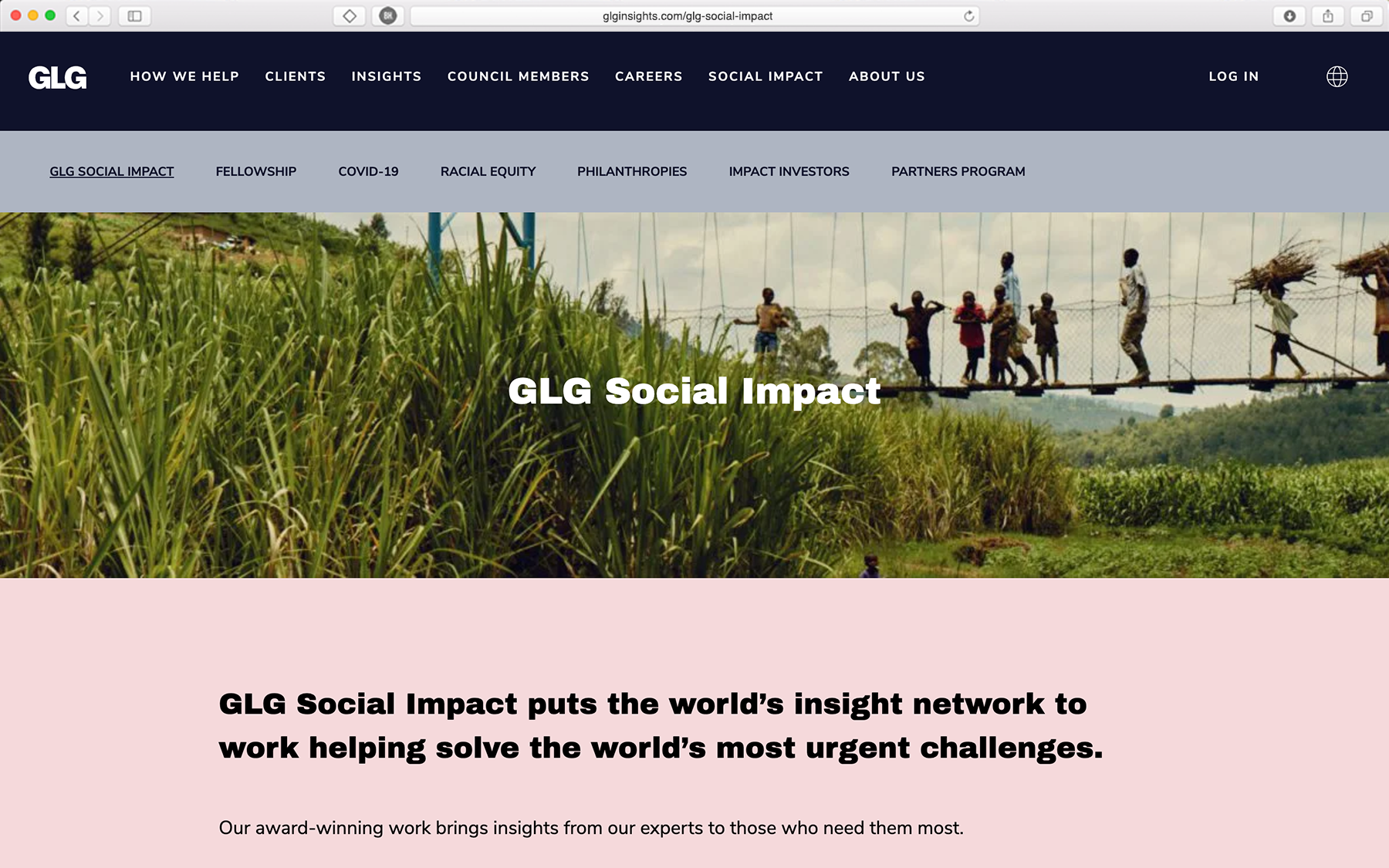 To announce and welcome the new class of fellows apart of the Social Impact work at GLG we were asked to design a clean and beautiful magazine that captured the breadth of the amazing talent coming through. A year later, with the onset of COVID-19, we pivoted a focus from print to revamping the digital site to repurpose and configure existing modules to fit the needs of the Social Impact arm. Images and communication were keys to showcasing the partners and fellows and highlighting the reach of the work.